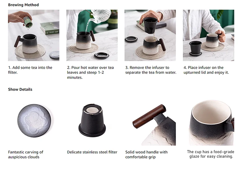 This multifunctional ceramic mug features a ceramic filter and removable lid, allowing for easy loose tea brewing. The removable filter can be hand washed or placed in the dishwasher, while the lid can also act as a coaster for a teapot. The wooden handle provides an anti-scalding feature for added safety, though it is not suitable for microwave use. Measuring approximately 3.1*4.9*5.6 inches (8.5*11.7*13.5CM) and with a capacity of 350ML, this mug is perfect for coffee, tea, or other beverages. Its versatile design is suitable for various settings such as the office, study, balcony, or garden, making it an essential addition to your daily routine!