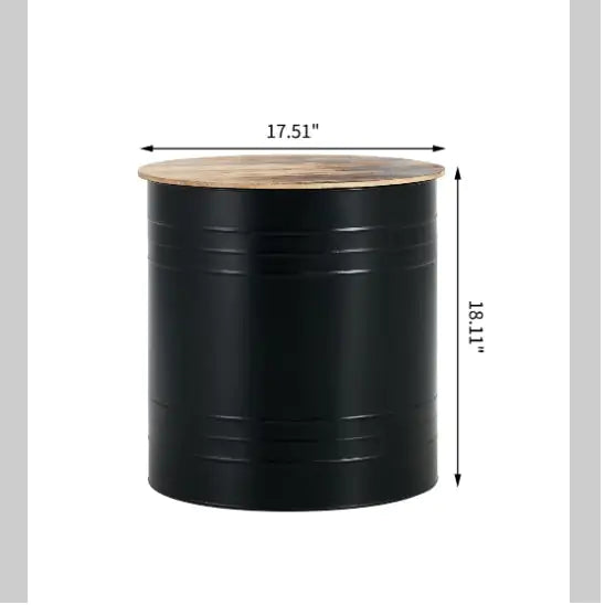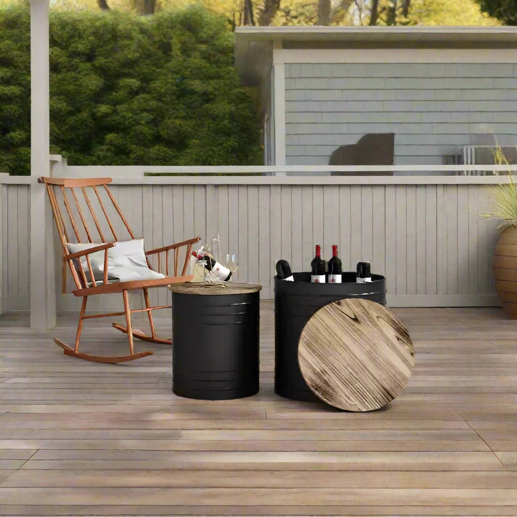 Oak & Iron Cocktail Tables. Set of 2; dimensions in pictures. Comes in black or silver/white. Lids come off for cocktail storage (and regular storage when not in use)!